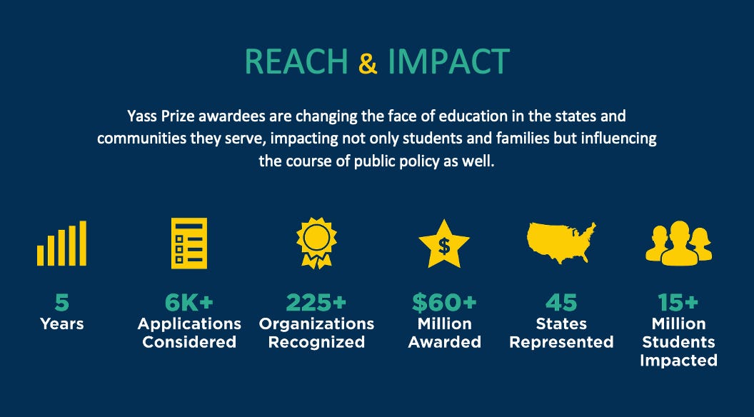Happy New Year and welcome back to Innovation in Action, a bi-weekly news brief highlighting transformative voices from within the Yass Prize community of awardees. The Yass Prize for Sustainable, Transformational, Outstanding and Permissionless education, now in its sixth year, is a rapidly growing effort to find, reward, celebrate and expand best-in-class education organizations from every sector, in every state.