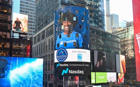 Edna Martinson, Co-Founder of Boddle Learning, for being recognized by the Nasdaq Entrepreneurial Center as part of the Fall 2025 Milestone Makers cohort and for having Boddle showcased on Times Square.